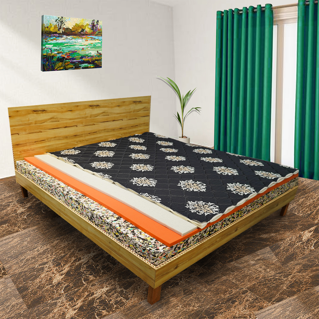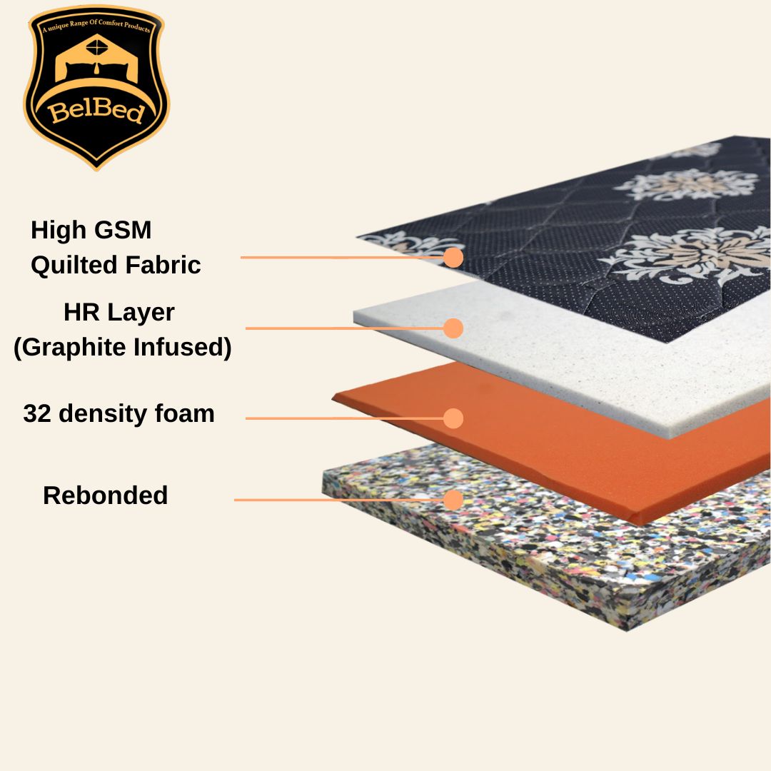 Dual Comfort HR has a high-density re-bound foam as the base layer followed by 32 medium density foam in the middle and High Resilience (ability to bounce back up) foam which is infused with graphite crystals as the top layer all wrapped together in a good quality quilted fabric.
